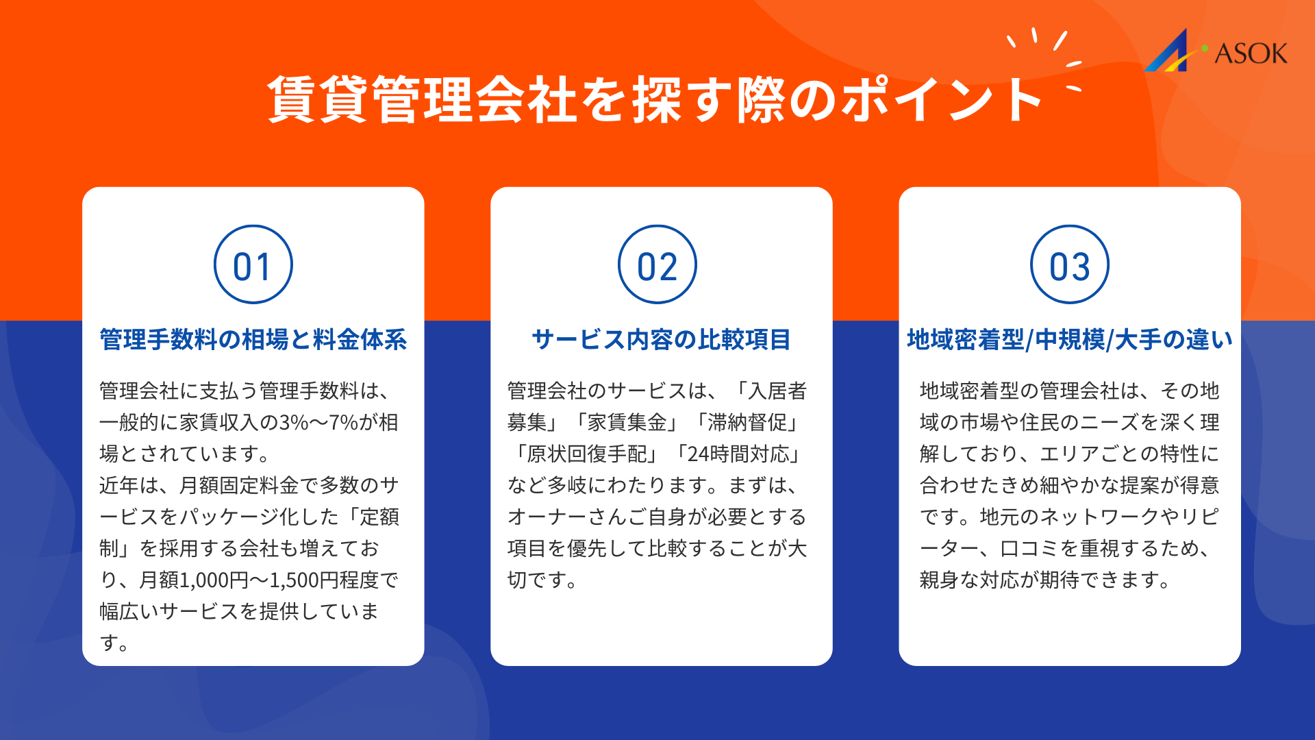 具体的には、管理手数料や対応範囲、地域性などの比較ポイントが明確になり、最適な会社を選ぶ判断材料を得られるでしょう。