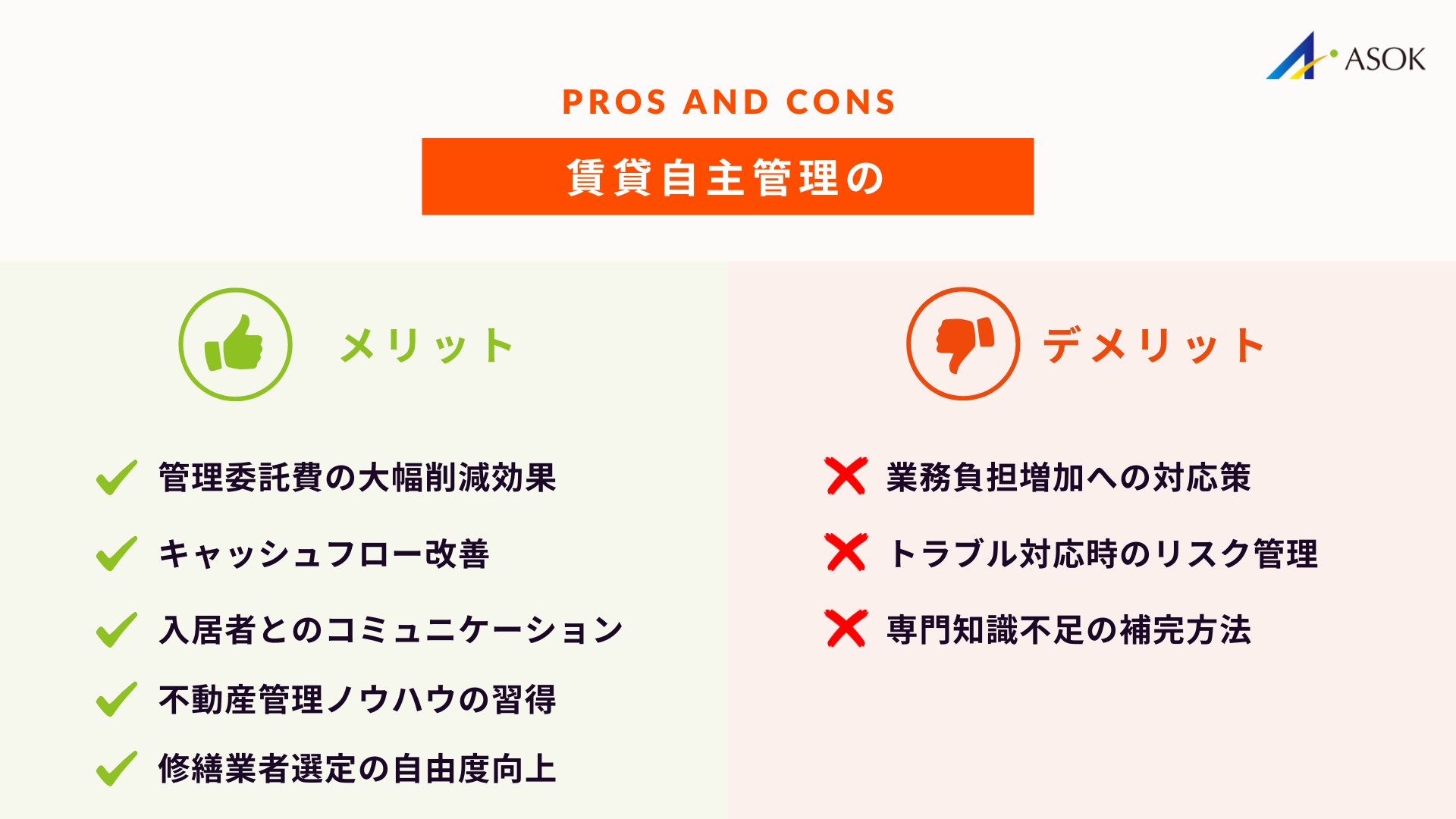 それぞれメリット・デメリットが異なるため、物件規模やオーナー様ご自身の時間的な余裕に応じて最適な選択が可能です。